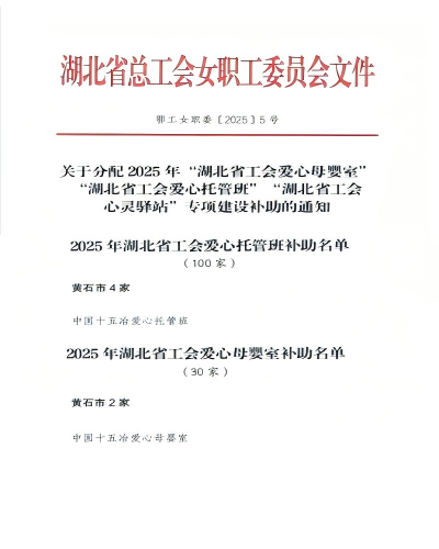 近日,中国十五冶喜获湖北省、黄石市总工会爱心母婴室、爱心托管班等多项专项补助,充分彰显了上级工会对公司职工关怀工作的肯定与支持。