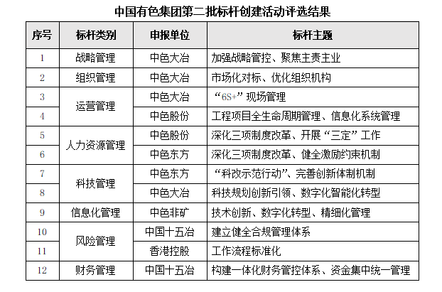 为进一步贯彻落实国企改革三年行动部署要求,指导推动出资企业巩固提升改革成效,中国有色集团对照国资委对标世界一流管理提升行动要求,组织开展了第二批管理提升典型标杆创建活动,围绕战略管理、组织管理、运营管理、人力资源管理、科技管理、信息化管理、风险管理、财务管理八个方面评选12项典型标杆,并予发布。