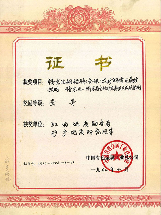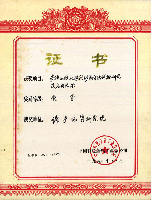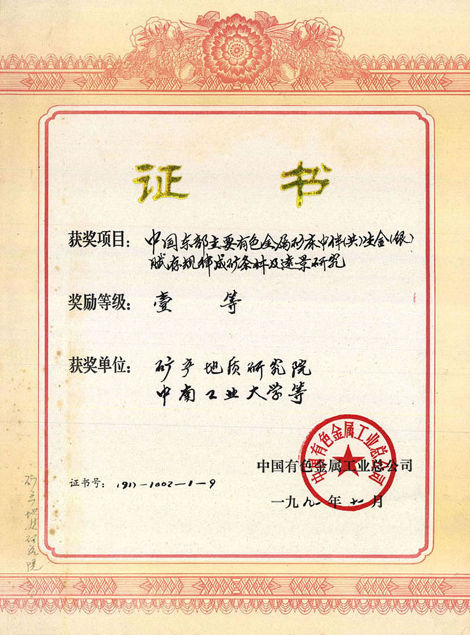 中国有色金属工业总公司科技进步奖一等奖-1990年