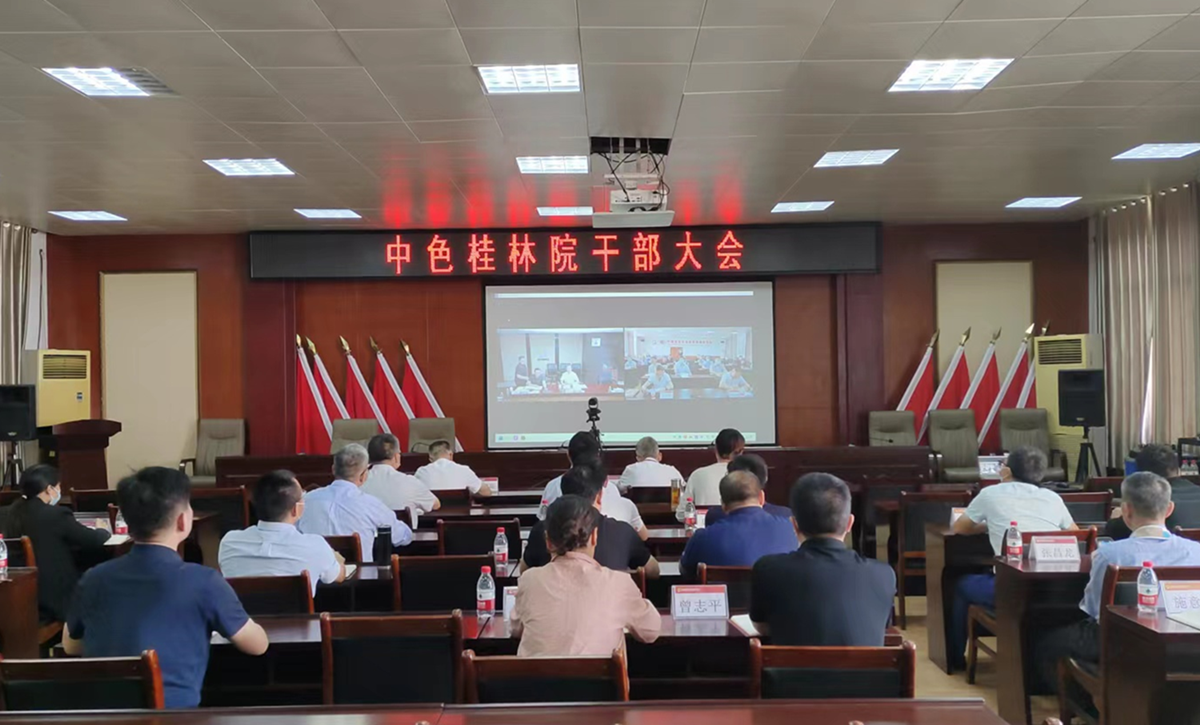 本次干部大会以视频+现场会议形式召开,中国有色集团领导、中色桂林院领导班子成员、副职以上中层干部参加会议。