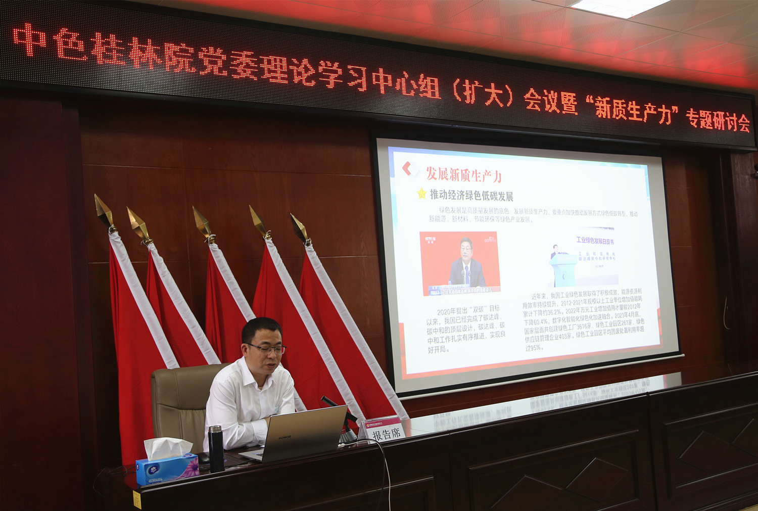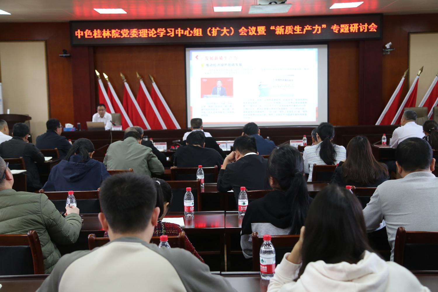 会议特邀广西师范大学中共党史党建副院长、副教授、研究员王成作了《深刻认识把握新质生产力的本质和丰富内涵》的授课辅导报告。报告深入浅出、内容丰富,深刻阐述了新质生产力的基本内涵、逻辑理路和发展路径,并对中色桂林院充分利用自身区位优势、技术优势、人才优势拓展资源,找准发展新质生产力着力点,推动企业高质量发展提供了很好的建议和指导。