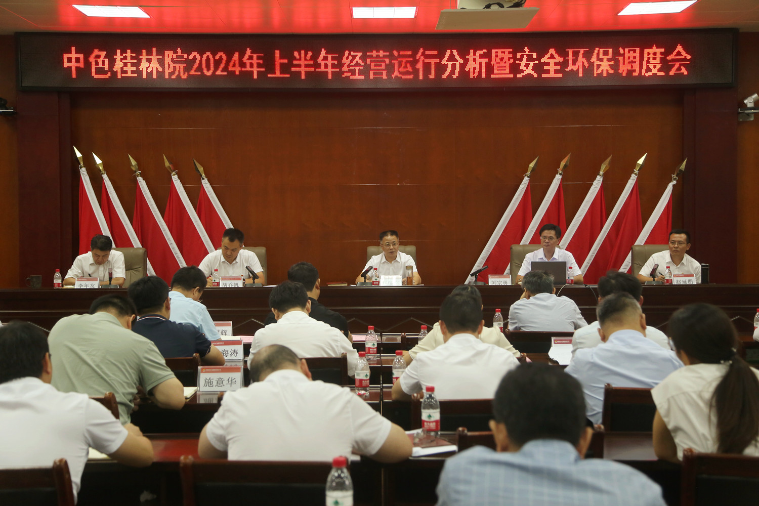 8月2日,中色桂林院召开2024 年上半年经营运行分析暨安全环保调度会。会议坚持以习近平新时代中国特色社会主义思想为指导,传达学习党的二十届三中全会精神,贯彻落实集团公司2024年年中工作会会议精神,回顾总结公司上半年以来的工作进展,客观分析经营运行、科技创新、改革发展、重点专项、安全环保等方面存在的问题,分析当前形势,查缺漏、强短板、补弱项、明目标、立军令、提信心,研究部署下半年重点工作,确保全面完成经营目标及重点专项工作。中色桂林院党委书记、董事长、总经理杨国高出席会议并讲话,党委委员、总会计师刘宗勇作上半年工作完成情况通报,党委委员、副总经理赵延朋作上半年安全环保工作报告,党委委员、副总经理胡乔帆主持会议。
